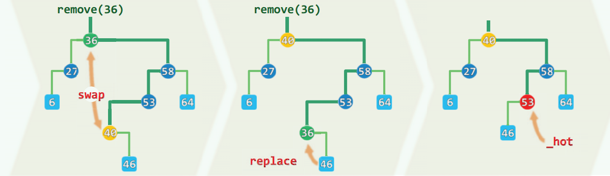 BinNodePosi<T> w = x; BinNodePosi<T> succ = NULL; if (!HasLChild (*x)) succ = x = x->rc; else if (!HasRChild (*x)) succ = x = x->lc; else { w = w->succ(); swap(x->data, w->data); BinNodePosi<T> u = w->parent; printf("u %d x %d \n",u->data,x->data); ((u == x) ? u->rc : u->lc) = succ = w->rc; } hot = w->parent; if (succ) succ->parent = hot; release(w->data); release(w); return succ; }