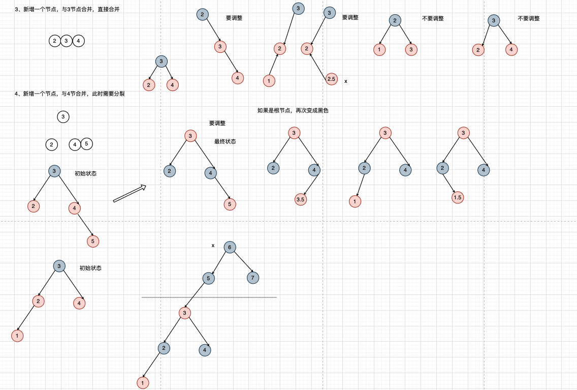 4-节点:包含 3 个元素的节点,有 4 个子节点; 所有节点必须至少包含1个元素
